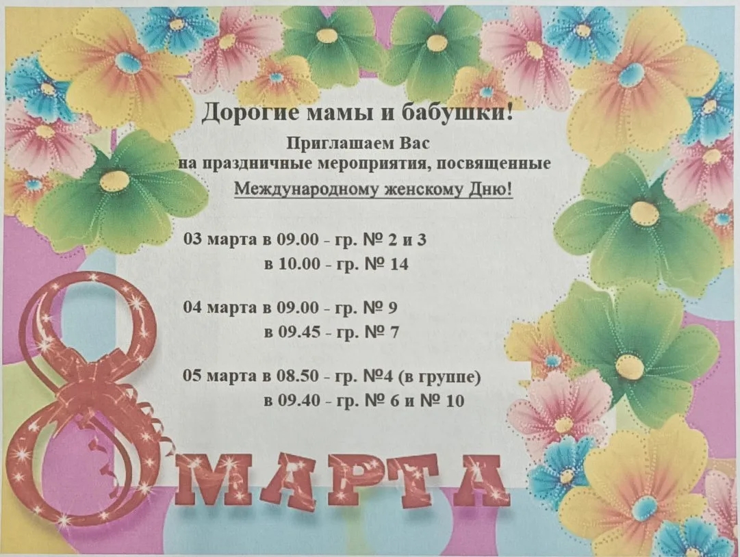 Уважаемые родители! Приглашаем вас на развлечения, посвященные 8 марта.