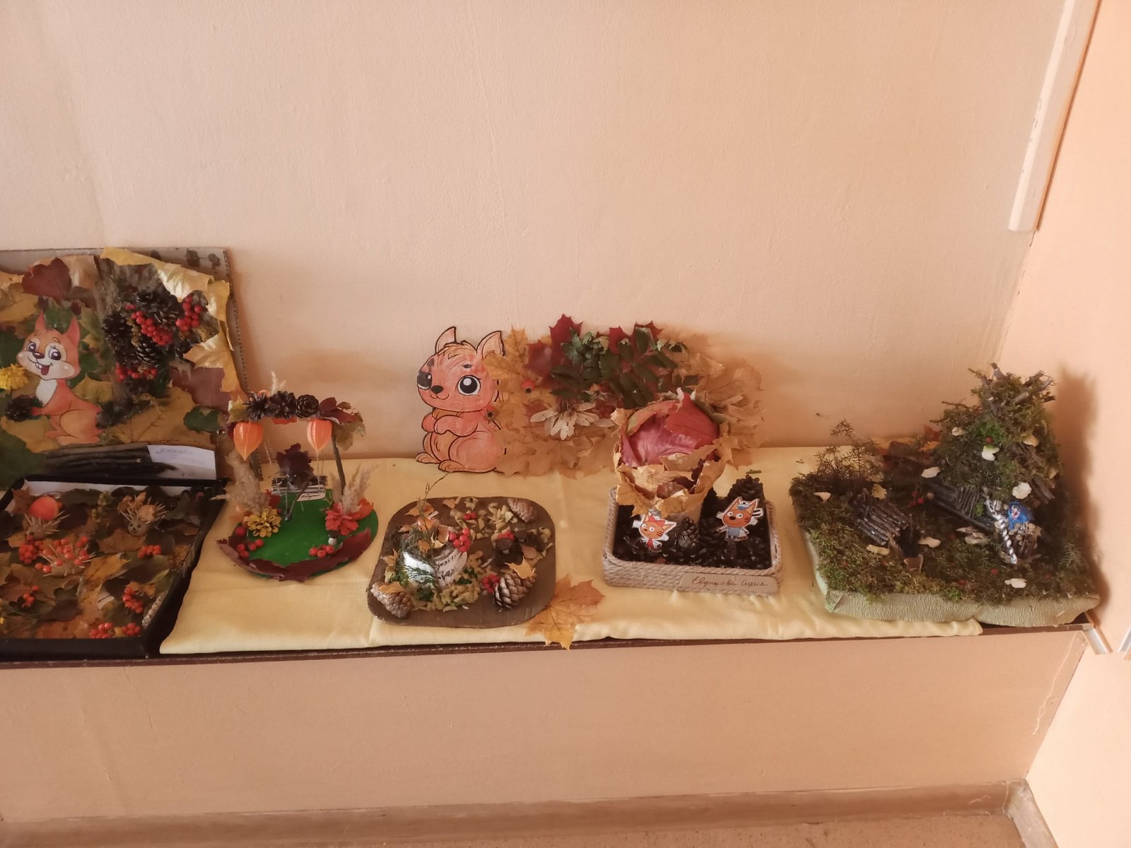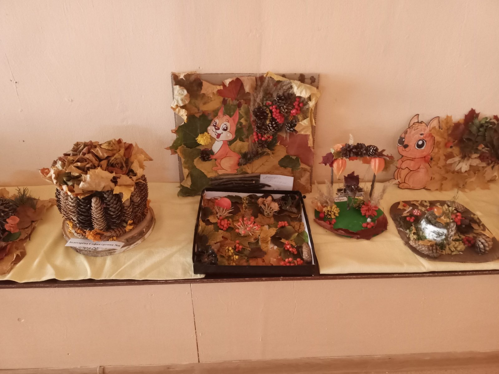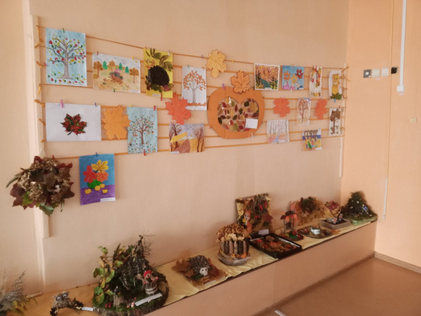На выставке представлены рисунки с изображением осенних пейзажей, деревьев с яркими листьями, а также поделки из природных материалов.